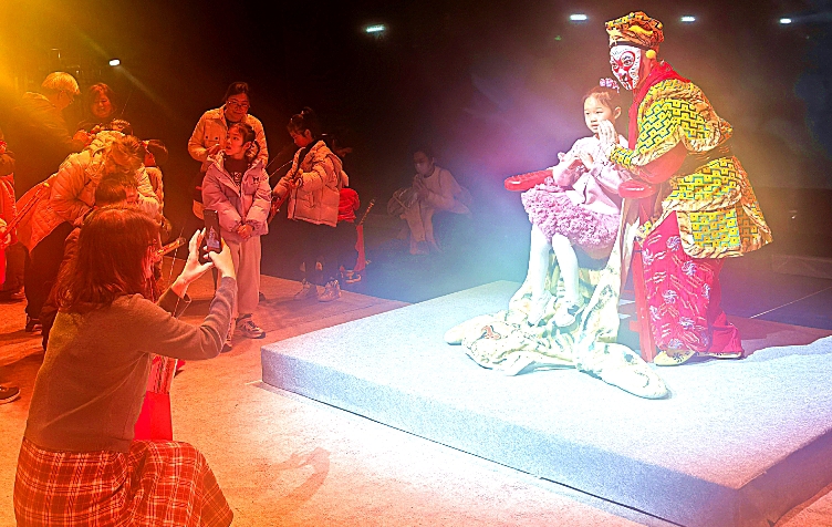《大圣来了》以传统戏曲为支点,融合音乐、歌舞等现代舞台剧元素,将经典“美猴王”IP搬上舞台,让传统艺术在创意互动中走进市民生活。演出结束后,主办方特别安排了后台体验活动,邀请亲子家庭走进幕后。在工作人员的引导下,孩子们戴上猴冠、穿上披风,在猴王椅上拍照留念。专业演员现场示范经典动作,手把手教耍猴棍的要领,小家伙们踊跃跟学,现场气氛热烈。